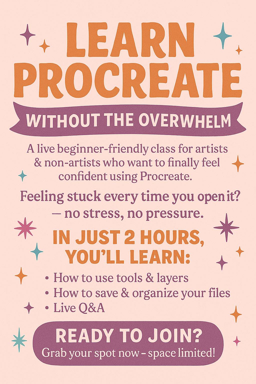 It’s a live, beginner-friendly workshop happening on Saturday, June 7th at 6 PM CST, designed to help you finally feel comfortable with the Procreate app — no pressure, no perfection required.